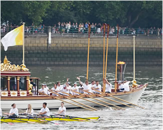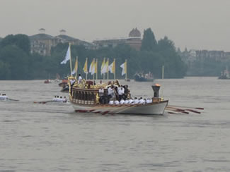 | Crowds on Putney Embankment | Patriotic supporters and unusual forms of transport! |