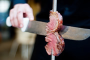 Though I've travelled extensively, Brazil is one location I've never made it to. A churrascaria, meaning 'steak house' or 'place where you eat barbecue', is apparently a common sight in Brazil. The term rodizio refers to a style of restaurant service where the waiters rotate the tables with a variety of barbecued meats until the customers signify that they've had enough, often with a card on the table that's green on one side (go) and red on the other (stop). And how much will this meat-fest set you back? Not very much at all, as it's all at a fixed price.